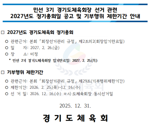 ○ 공 고 명: 2026년 경기도종목단체 신규 가입 공고 ○ 공고기간: 2025. 12. 1.(월) ~ 31.(수) ○ 접수기간: 2025. 12. 1.(월) ~ 31.(수)…