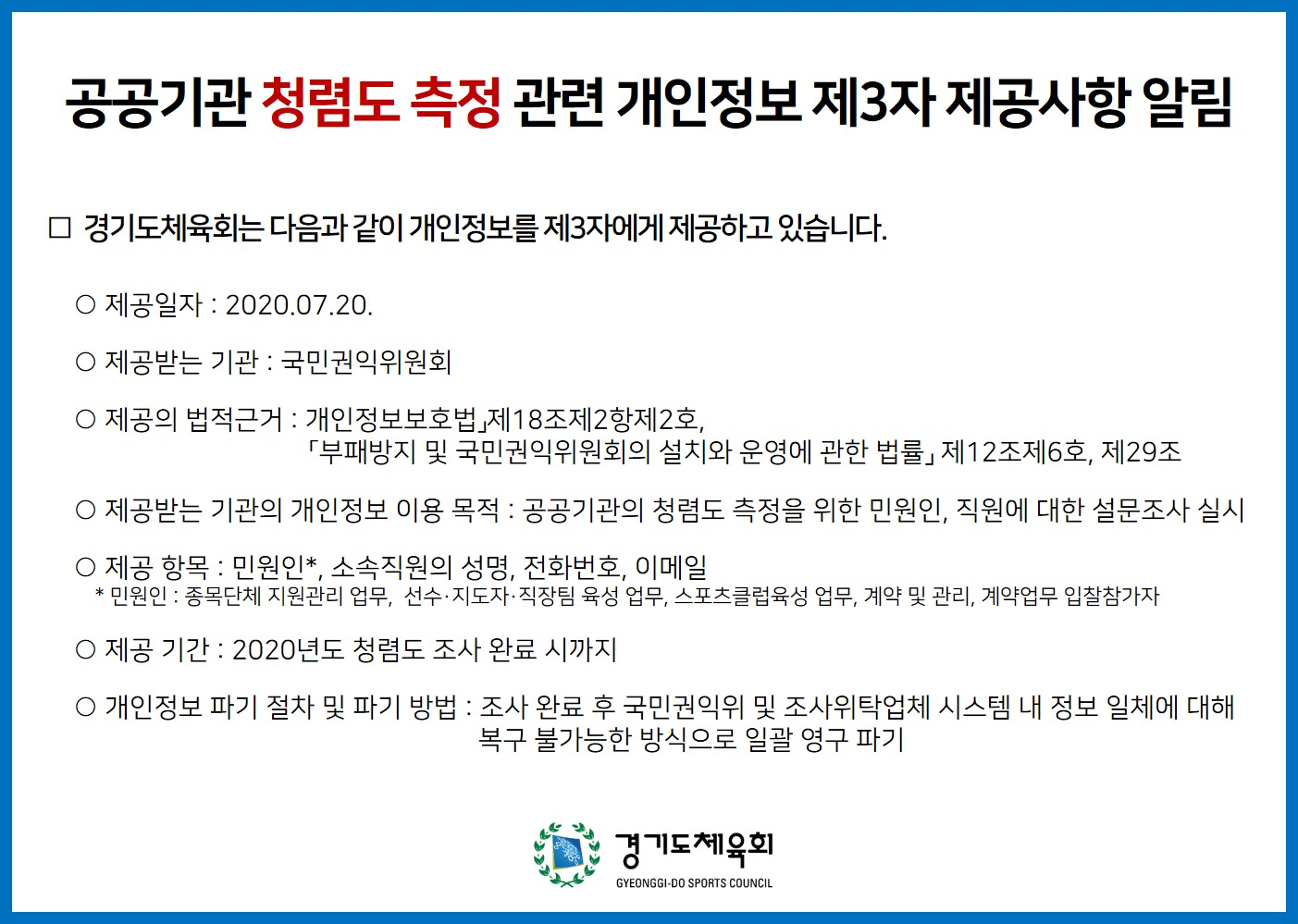 공공기관 청렴도 측정 관련 개인정보 제3자 제공사항 알림