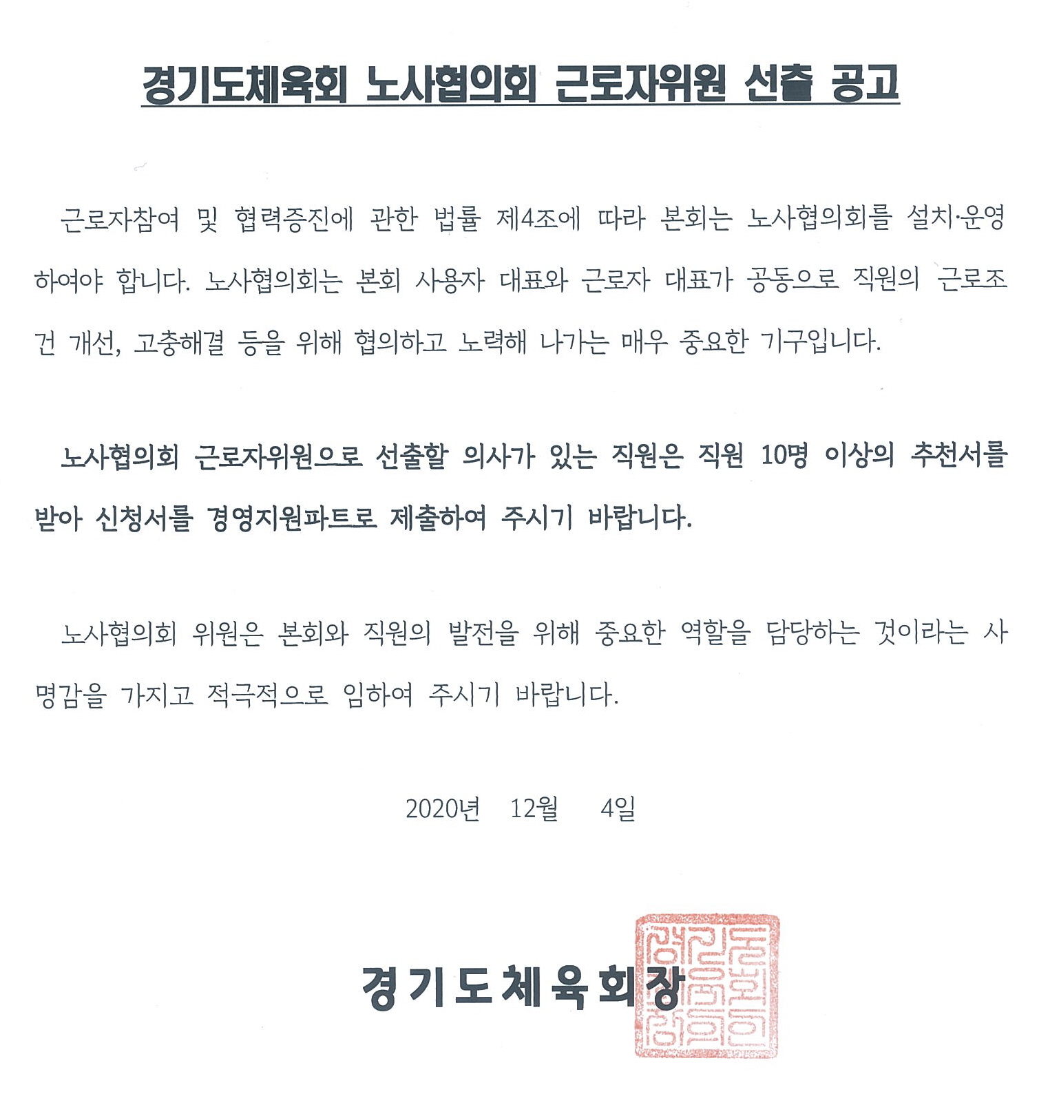 경기도체육회 노사협의회 근로자위원 선정 공고