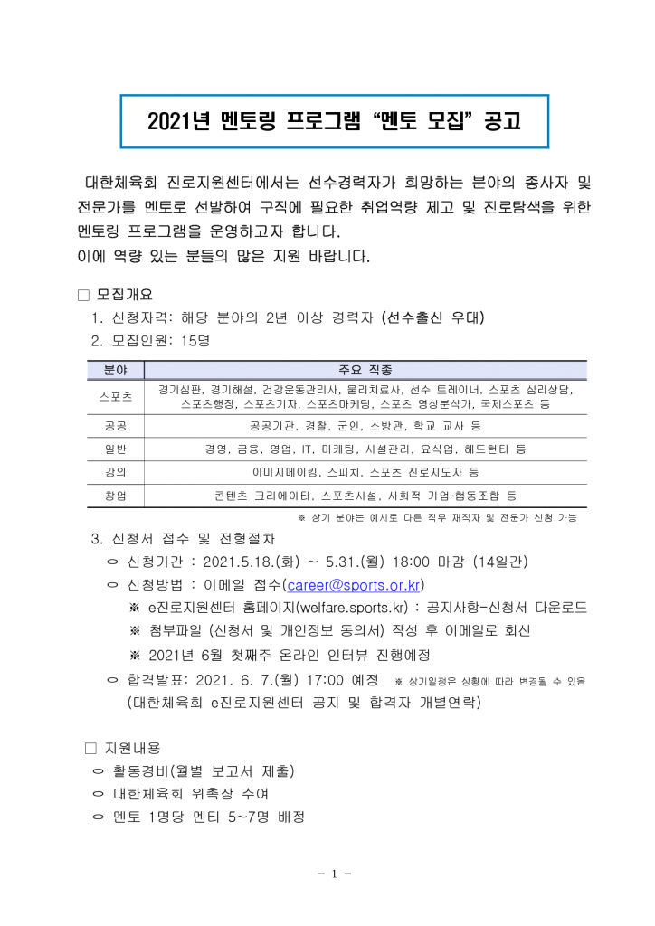 대한체육회 진로지원센터 2021년 멘토링 프로그램 멘토모집 안내