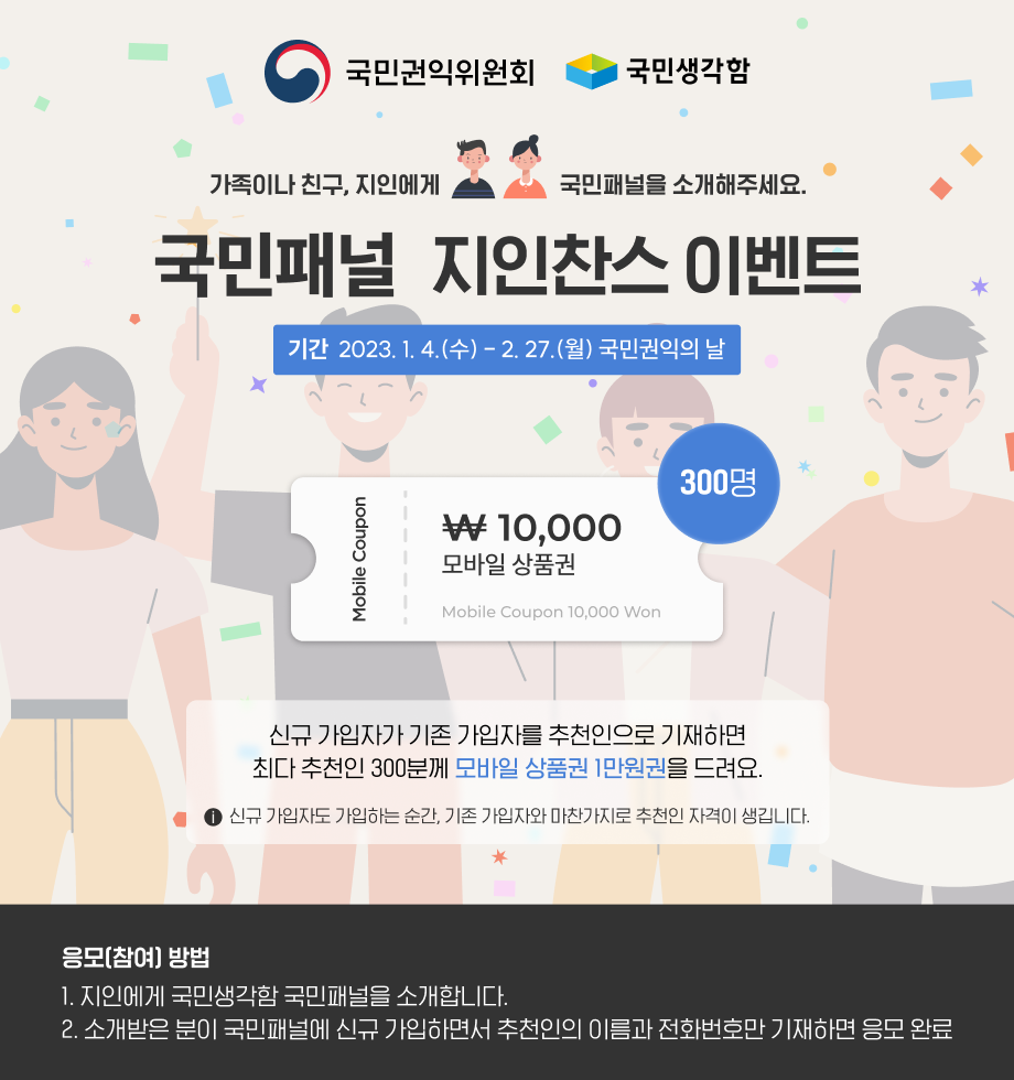 국민권익위원회에서는 국민의 의견을 신속하고 정확하게 파악하여 정책에 반영하고자 국민패널을 모집하고 있습니다.