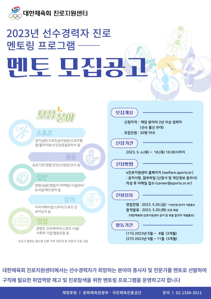 대한체육회는 진로지원센터에서 선수경력자(은퇴/현역)가 희망하는 분야의 종사자 및 전문가를 멘토로 선발하여 멘토링 프로그램을 운영하고자 하오니 관심있는 분들은 멘토 모집에 신청부탁드립니다!