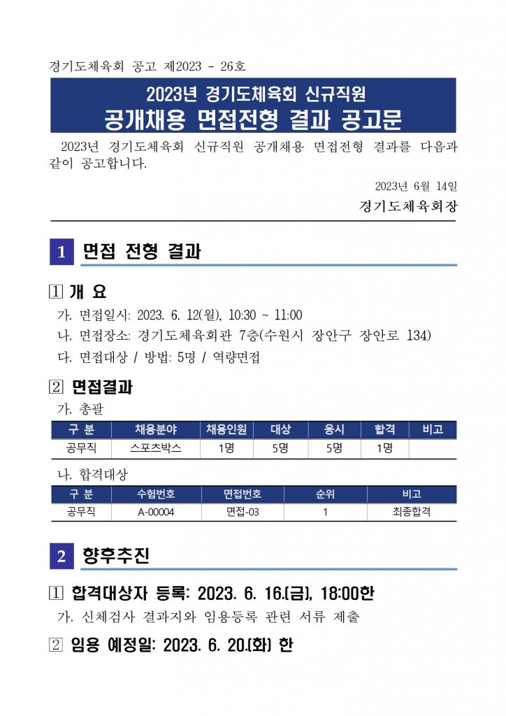 2023년 경기도체육회 신규직원 공개채용 면접전형 결과를 다음과 같이 공고합니다.