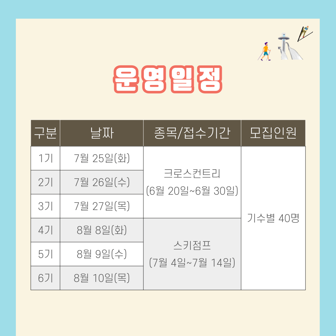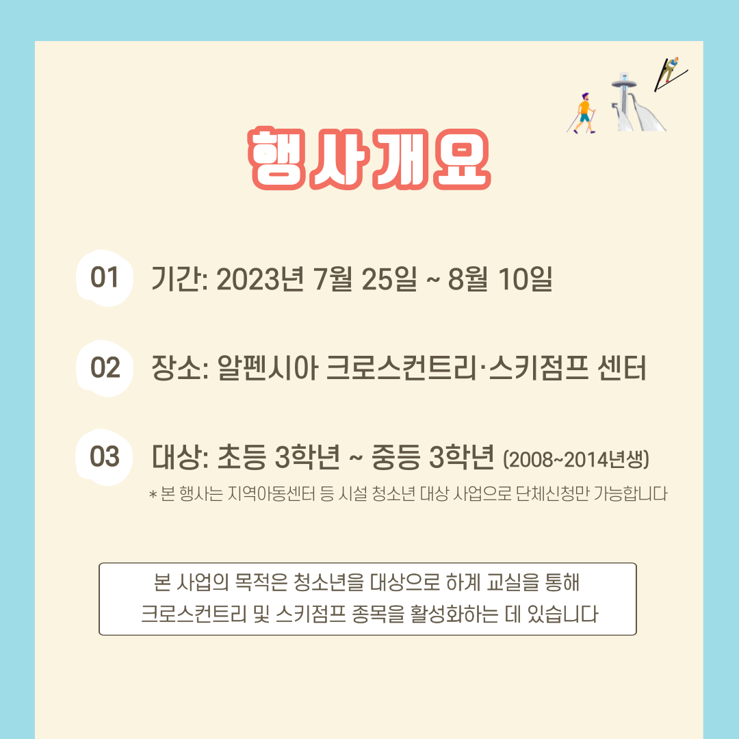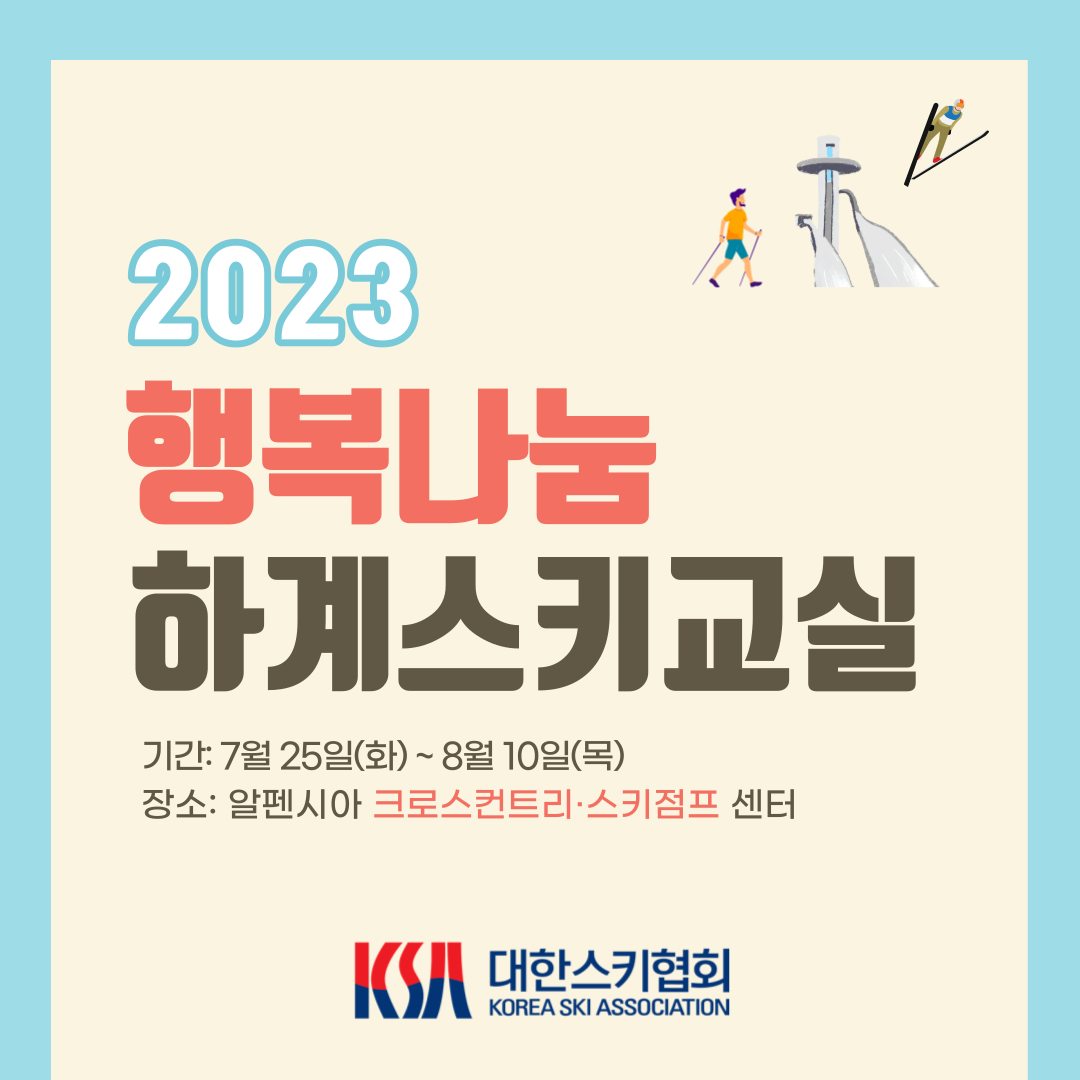 대한스키협회에서는 사회복지시설(지역아동센터 포함) 청소년을 대상으로 2023년 행복나눔 하계스키교실을 개최합니다.