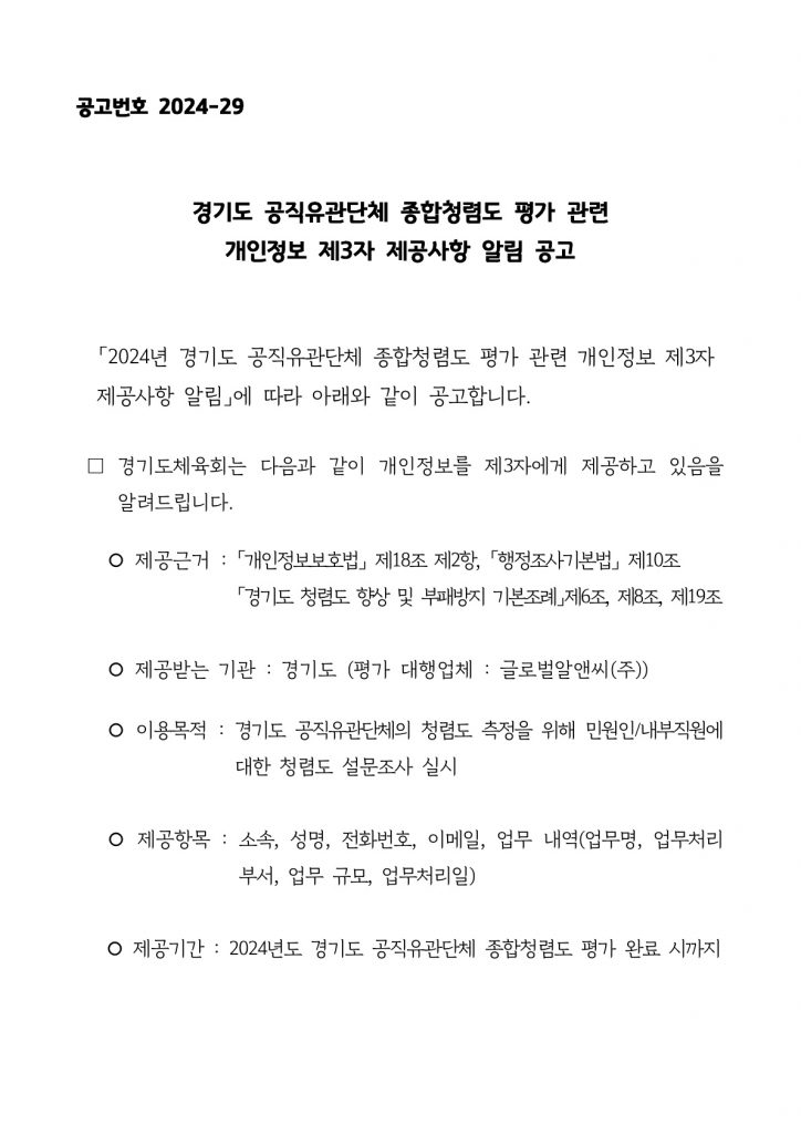 경기도 공직유관단체 종합청렴도 평가 관련 개인정보 제3자 제공사항 알림 공고