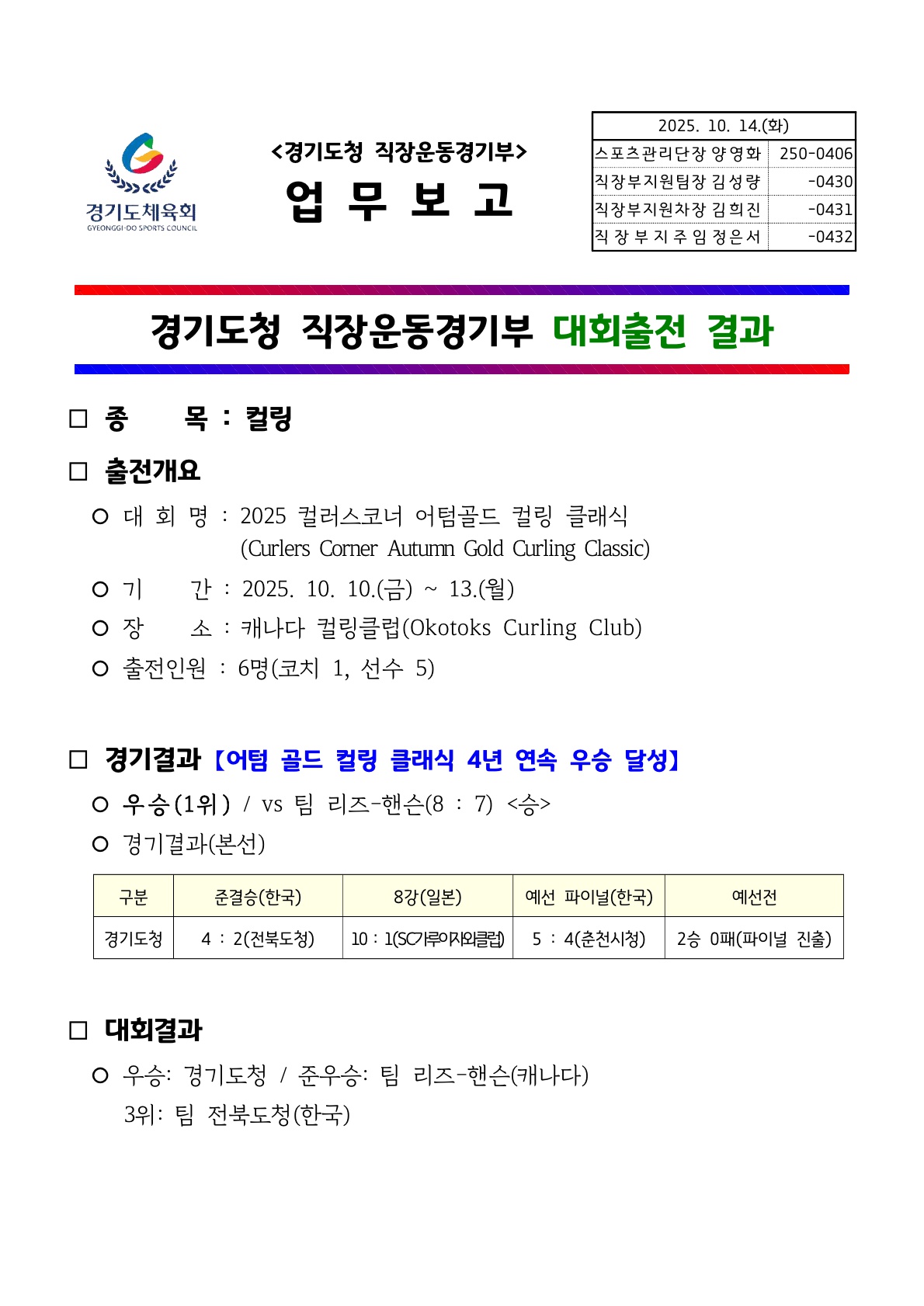 251014 보도자료(경기도청 컬링팀, 캐나다 어텀골드 클래식 4연패 달성)